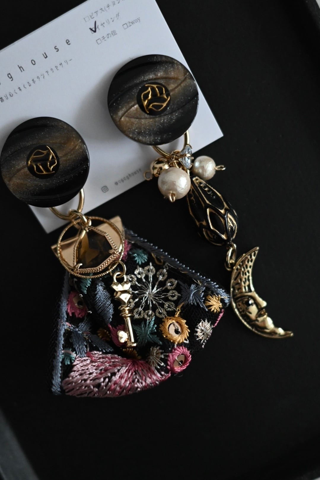 数ある作品の中からご覧頂きありがとうございます。 カラフル刺繍リボンとにゃんこチェコガラスビーズが かわいい耳飾りです(写真はイヤリング) よーく見ると月モチーフのチャームがついていたり細部までこだわって 製作しております。 アシンメトリーなデザインに挑戦したことのない方におすすめしたい1点!!! 絶妙なバランス、色味♡是非体感してみてください。 また、チャームを取り外すことも可能です。ボタンだけで楽しんでも良し。 チャームをつけて華やかに楽しむも良し。2WAYタイプです!! サイズ:チャーム有り全長右7.7cm左7cm サイズ:ボタン直径2.1cm (装着部分素材)イヤリング:真鍮 ピアス:チタンポスト 金具をお選び頂けます。金具の選択、お間違いのないよう確認をお願いします。 ご注意 ご購入の際はお手数ですが、ショップ説明の注意事項を確認、ご理解の上ご購入をよろしくお願いします。 https://ogoghouse.base.shop/items/11355257