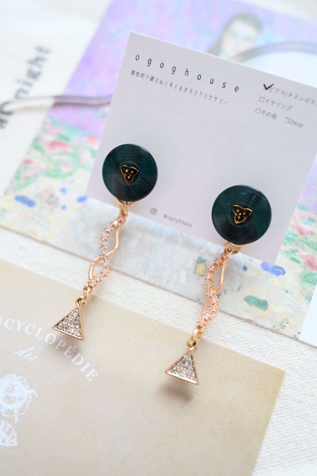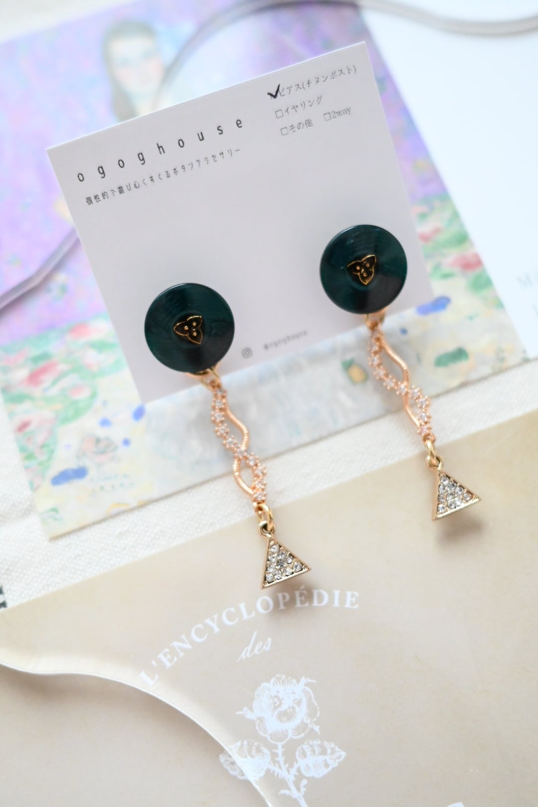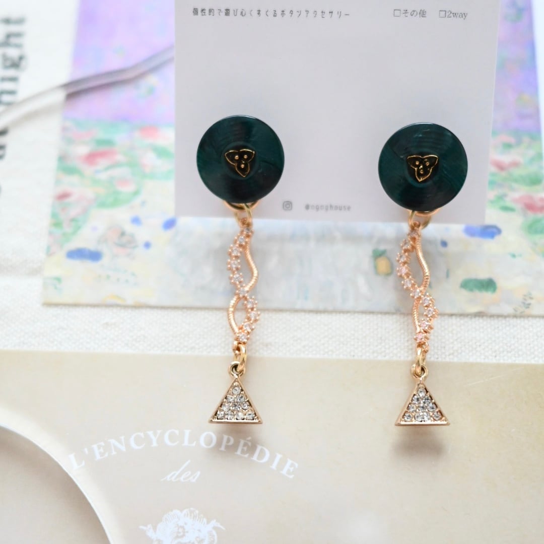 小さなボタンにきらきらビジューチャームを合わせた耳飾り(写真はピアス)