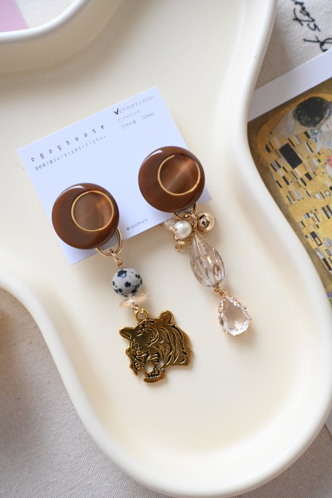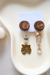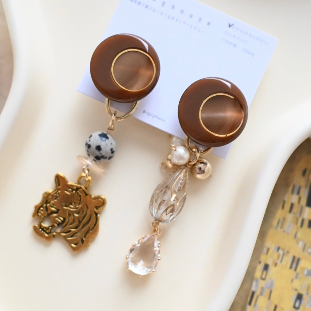 とらモチーフとダルメシアンジャスパーの天然石を合わせた耳飾りです。(写真はピアス)