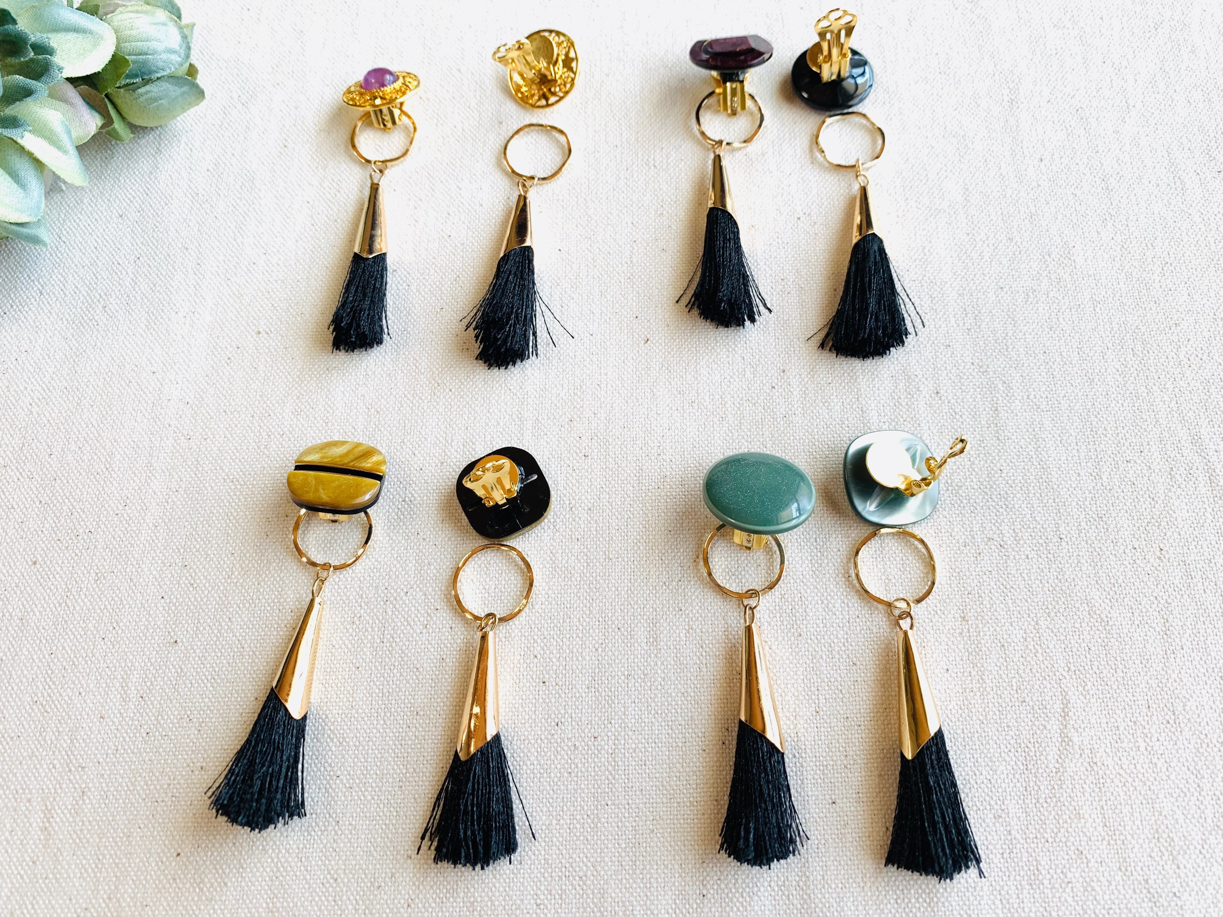 シンプルなレトロボタンとタッセルをあわせた耳飾り(写真はイヤリング)です。