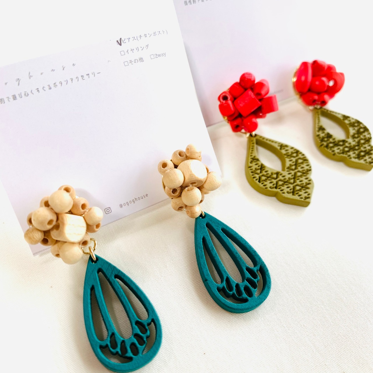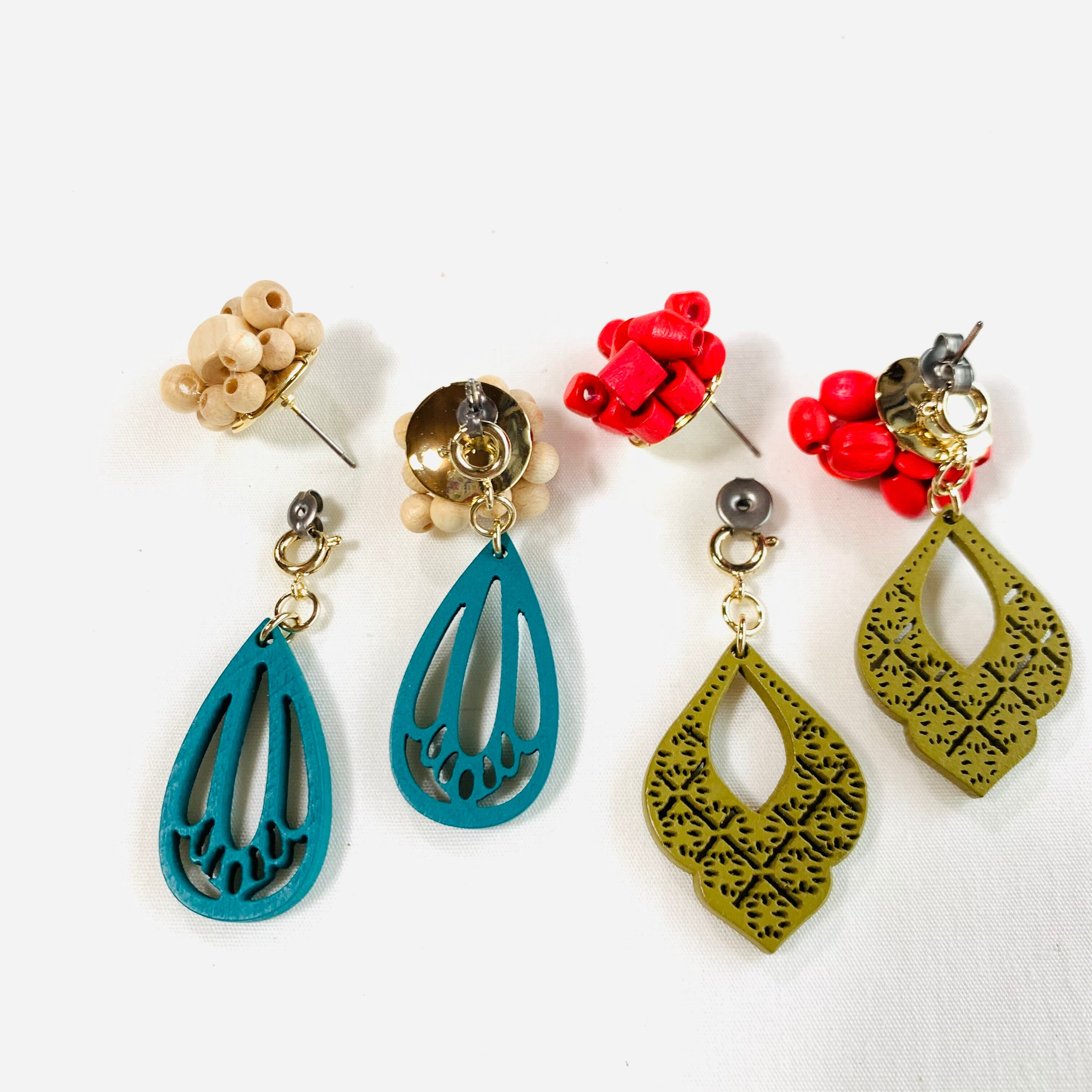 ウッドビーズを使ったピアス。1点1点丁寧にテグスであみ頑丈に仕上げました。